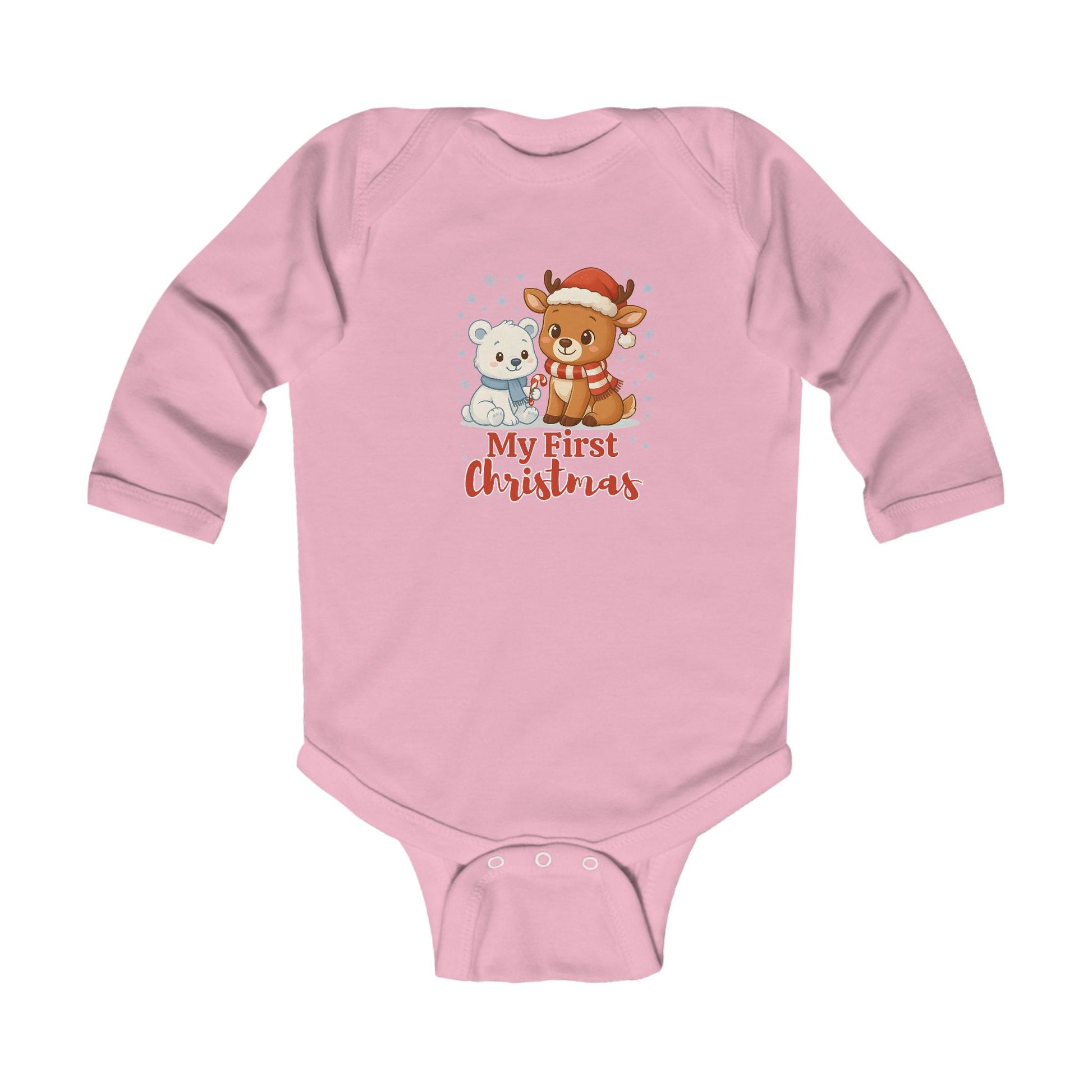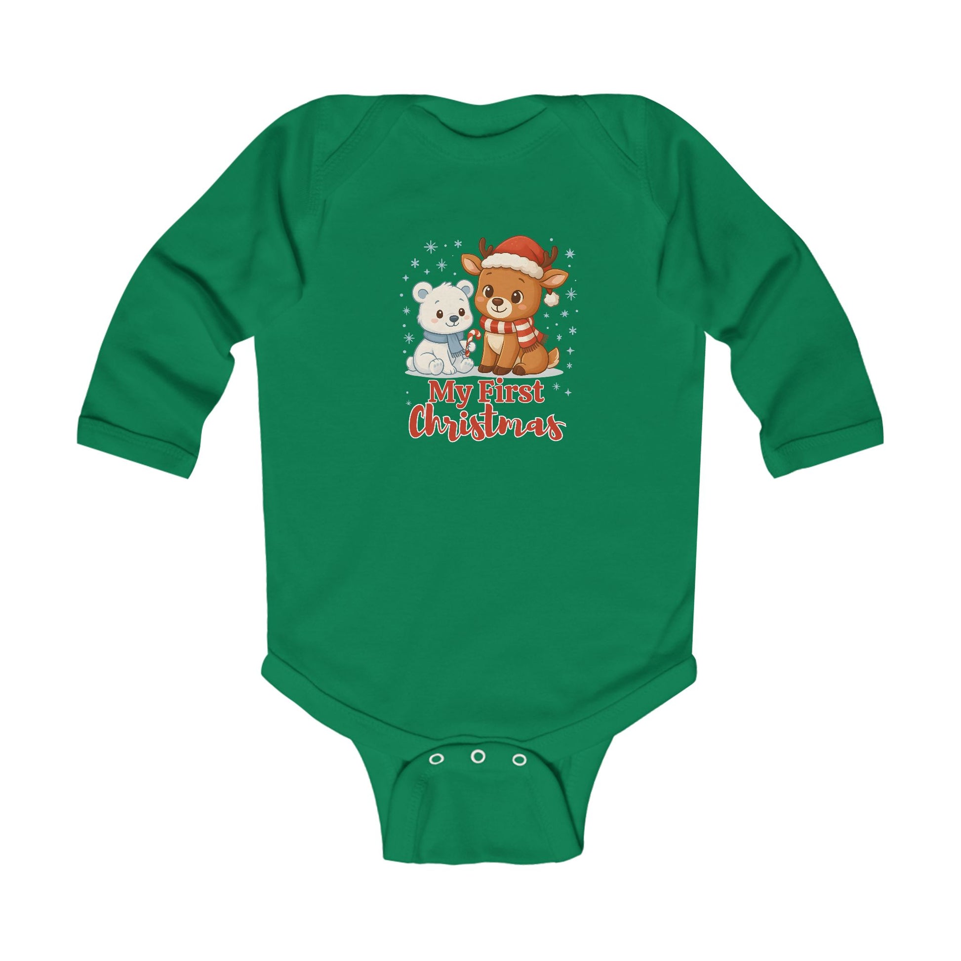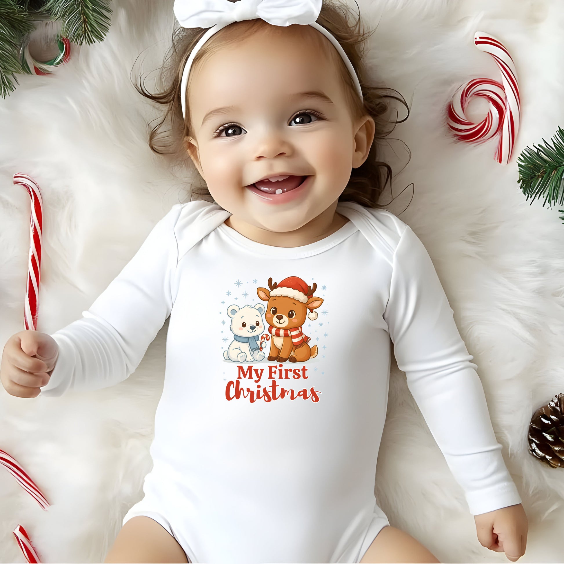 Celebrate your little one’s first Christmas with a keepsake that feels as soft and joyful as the season itself. This long-sleeve infant bodysuit features a sweet “My First Christmas” illustration with a cozy reindeer and a polar bear friend — perfect for holiday photos, gifting, or capturing those once-in-a-lifetime newborn moments.