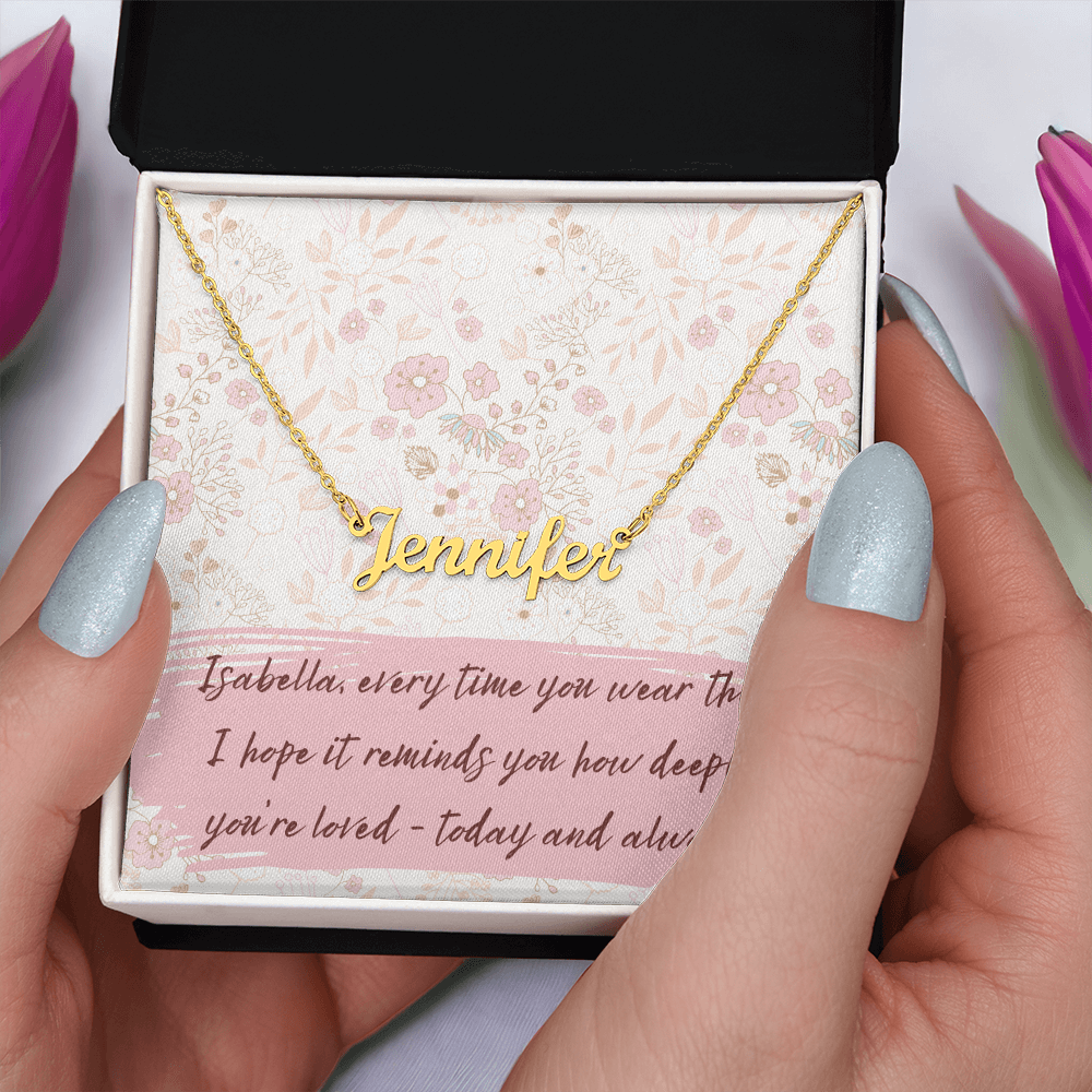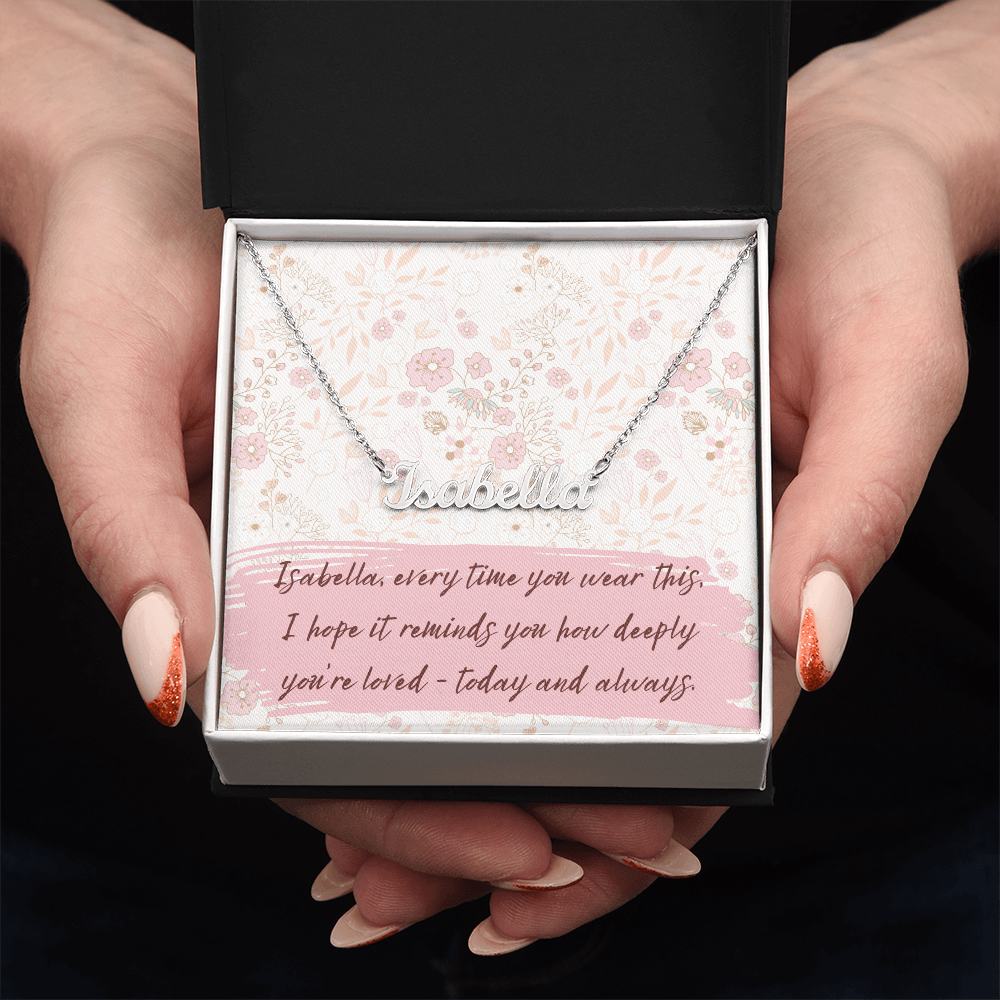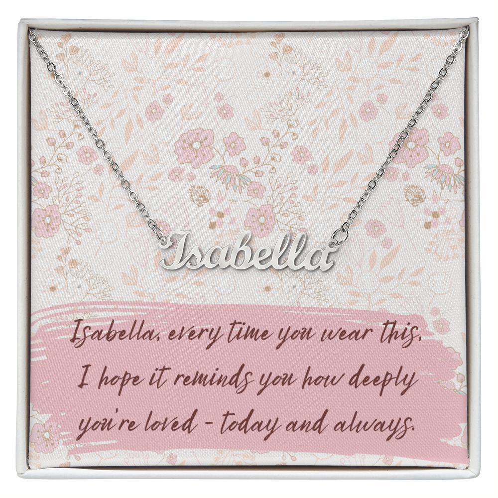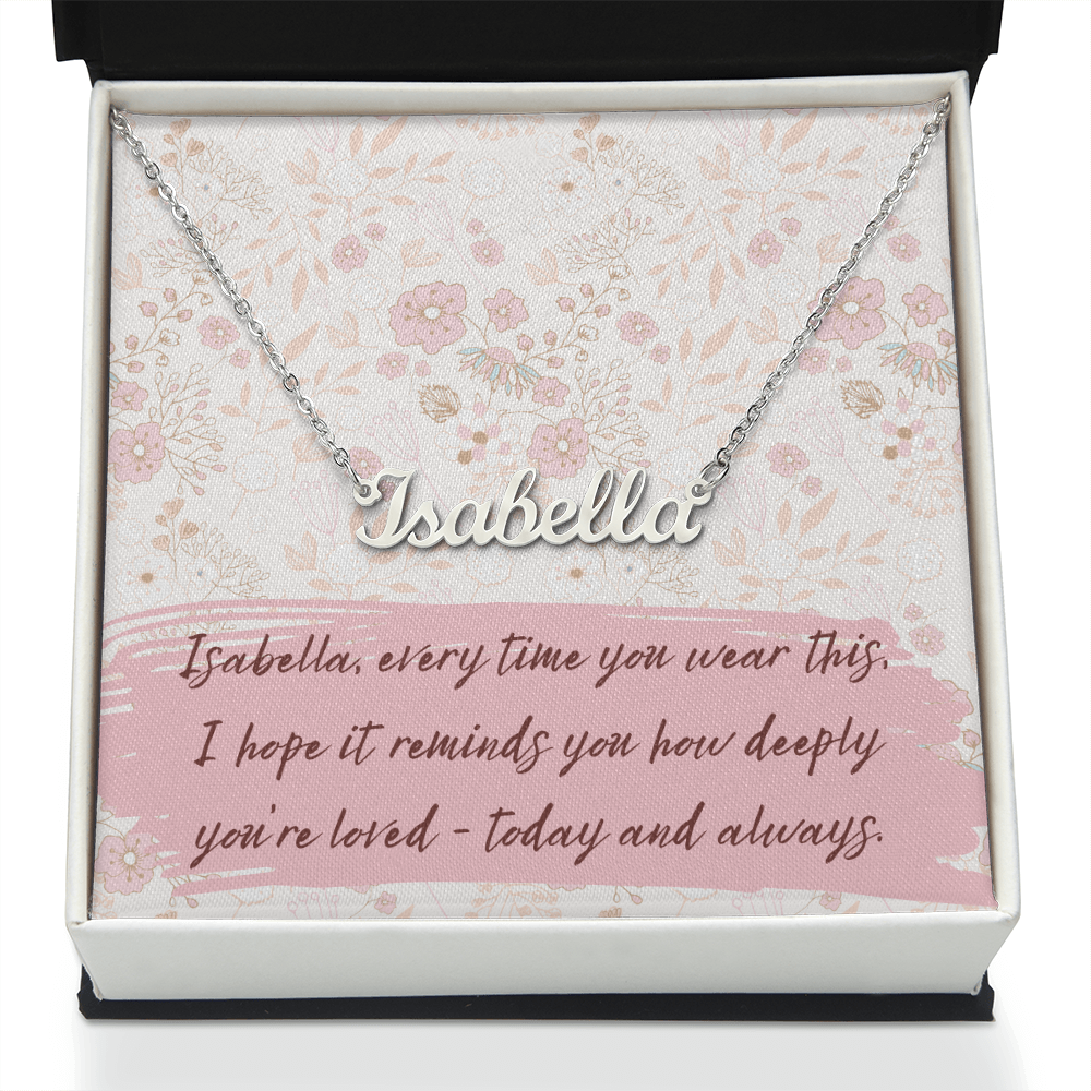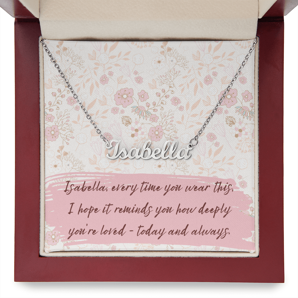 Surprise her with a truly one-of-a-kind keepsake she’ll cherish forever. This custom name necklace is beautifully crafted in polished sterling silver (with optional rose-gold plating) and arrives in a gift-ready box featuring your heartfelt message:
