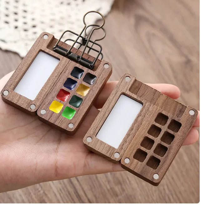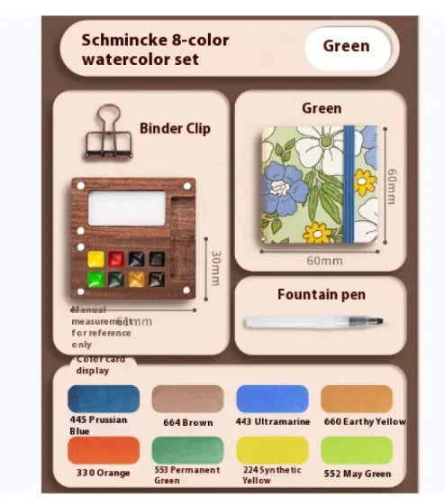 Mini Travel Watercolor Set – Portable Wooden Box Kit with 8 Colors, Sketchbook, Brush & Clip – Pocket-Sized Art Set for Painting On-the-Go