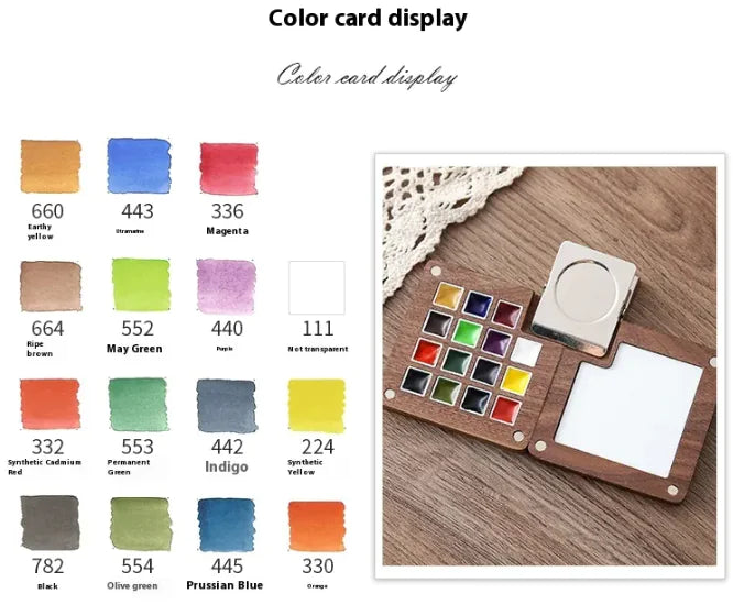 🎨 A handcrafted walnut-colored wooden box filled with 8 vibrant watercolor paints